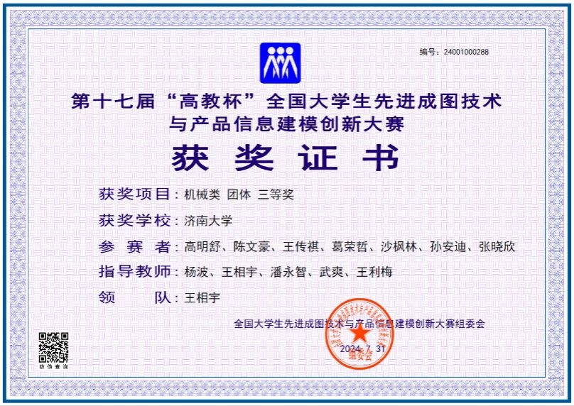 在全国总决赛中,济南大学荣获机械类团体国家级三等奖,其中,我院学生高明舒获得先进成图技术赛道国家级二等奖,学生陈文豪、葛荣哲、沙枫林、王传祺分别获得先进成图技术赛道国家级三等奖;学生高明舒、葛荣哲得轻量化设计赛道国家级三等奖;指导教师杨波、王相宇、潘永智、武爽、王利梅分别获得机械类优秀指导教师国家级三等奖。
